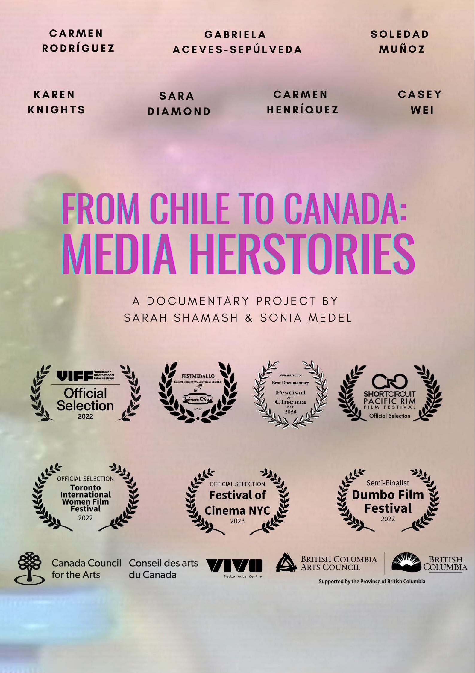 The story of Latin American media art herstories on unsurrendered Coast Salish land is examined in this intergenerational telling. Featuring Carmen Rodríguez, Soledad Muñoz, Gabriela Aceves-Sepúlveda, Carmen Henríquez, Casey Wei, Karen Knights, Sara Diamond, this (un)archival project revisits a historic 1987 all Chilean women media art event in Vancouver. Diasporic flows of knowledge exchange and feminist solidarities uncover the contributions of Latinx women revealing lesser known Canadian media art genealogies.